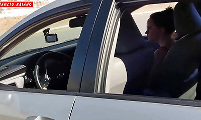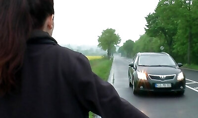 Hitchhiking brown-haired mega-bitch sucks a dude's cock in the car