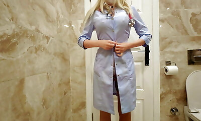 nurse in the hospital toilet masturbates and makes a flick on the phone for her subscribers
